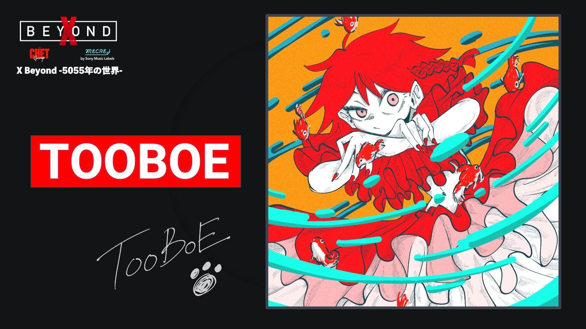 「クリエイティビティ×テクノロジー」の力でIP開発を行う株式会社CHET Group(本社:東京都品川区 代表取締役CEO:小池祐輔 以下、CHET)と株式会社ソニー・ミュージックレーベルズが運営するクリエイタープラットフォーム”MECRE”の共同プロジェクト『X Beyond(クロスビヨンド) -5055年の世界-』。アートアクアリウム美術館 GINZA 内のX Beyond常設展にて、TOOBOEが自ら手がけたアート作品の展示を9月15日より開始。また、同日19時半からTOOBOEがパーソナリティを務めるラジオ番組「TOOBOEのわるあがき」の出張版として、同会場から公式YouTubeチャンネルでのライブ配信も決定いたしました。