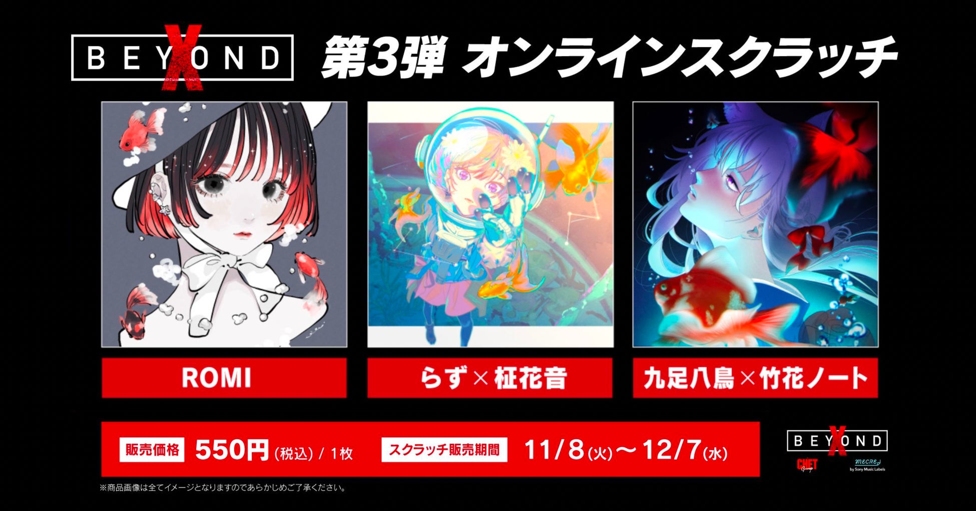 X Beyond第三弾として描き下ろした「九足八鳥 × 竹花ノート」、「らず × 柾花音」のコラボ作品2点と、「ROMI」の展示作品を使用したオリジナルグッズを、CHETが運営するエンタメECツール「CHETスクラッチ」にて販売いたします。